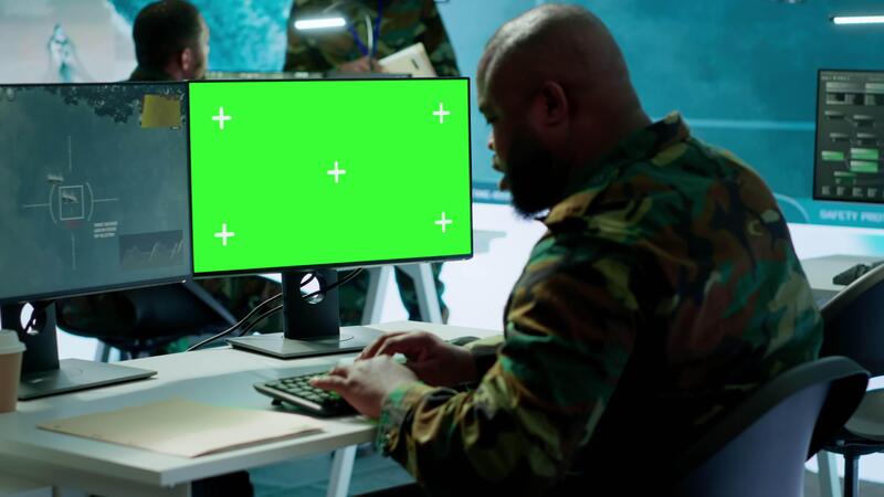 Soldier analyzing real time data next to green screen in high tech military office, processing intelligence for field operations and coordinating strategic missions to ensure national interests. Camera A. Pro Video