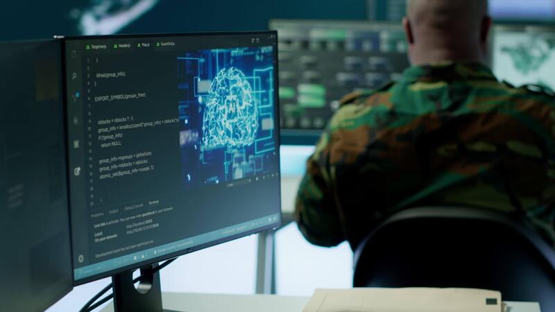 Cybersecurity expert oversees intelligence gathering through AI brain visualization and neural network, algorithms to collect real time data from surveillance systems. Digital science. Camera A. Pro Video