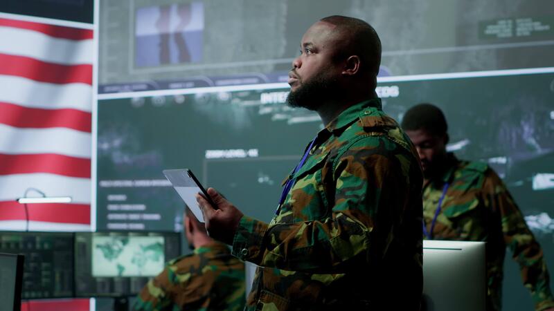 American military intelligence officers in a command center monitoring surveillance information in order to safeguard state secrets. Managing security in an army base of operations. Camera A. Pro Video