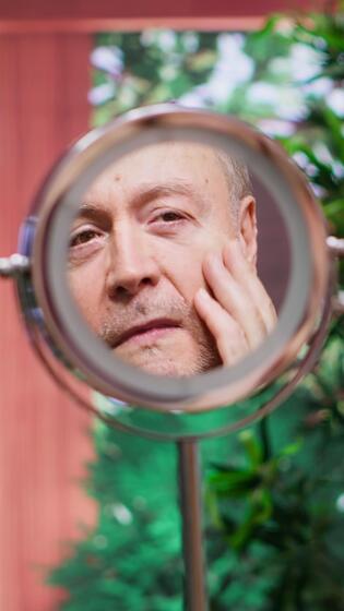 Vertical Elderly man looking in the mirror at his wrinkles and aging skin while he does his daily routine for grooming and skincare. Applying rejuvenating cream and lotion for hydration. Camera A. Pro Video