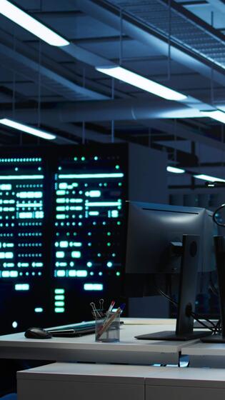 Vertical Person with paraplegia in inclusive server hub overseeing data center, making improvements. Woman in wheelchair doing tasks in data center, tracking network traffic, camera B Pro Video