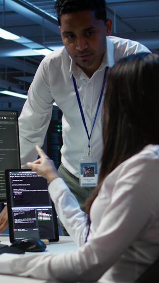 Vertical Engineering team colleagues in data center managing gear energy consumption, working on PC. Computer scientists using device in workspace used for automation in server room, camera B Pro Video