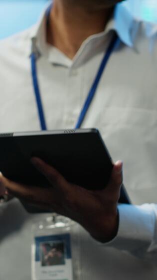Vertical Software developer walking in data center, managing and maintaining databases, ensuring data integrity and security. Close up of man updating server room mainframe systems using tablet, camera A Pro Video