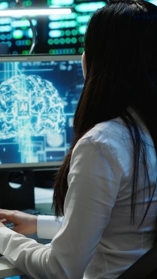 Vertical Technicians coworkers using AI tech on computer to do checkup in server room. Teamworking colleagues in data center using artificial intelligence technology to process datasets for training, camera A Pro Video