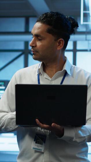 Vertical Technician using laptop in data center, managing servers, operating systems. Professional in server hub using notebook to ensure networks are secure and functioning properly, camera A Pro Video