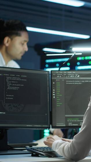 Vertical Team of researchers in data center monitoring security threats using PC, implementing cybersecurity measures. Teamworking colleagues ensuring compliance with regulations, camera A Pro Video