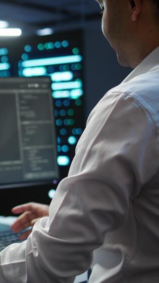 Vertical Data center system administrator responsible for installation of networking equipment solving tasks. IT employee at work doing maintenance on server room hardware, camera B Pro Video