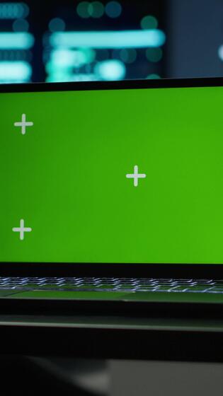 Vertical Focus on green screen laptop used by engineers in high tech data center to monitor security threats. Close up of mockup notebook used by workers ensuring compliance with regulations, camera A Pro Video