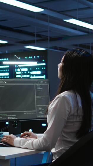 Vertical Engineer using augmented reality tech in data center, installing software, troubleshooting issues. IT expert in server hub looks at AR hologram, establishing performance benchmarks, camera B Pro Video