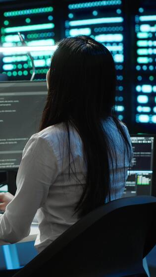 Vertical Engineer using augmented reality tech in data center, installing software, troubleshooting issues. IT expert in server hub looks at AR hologram, establishing performance benchmarks, camera A Pro Video