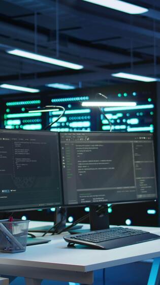 Vertical Computers in data center used for managing equipment rackmounts energy consumption. Panning shot of PC monitors in high tech establishment used for automation and monitoring processes in server hub Pro Video