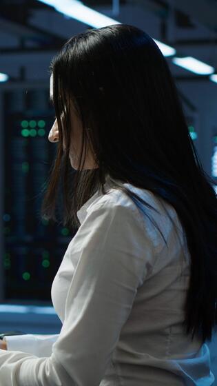 Vertical Portrait of smiling engineer overseeing data center, making improvements and updates to ensure system can handle networking tasks. Upbeat server room worker tracking network traffic, camera A Pro Video