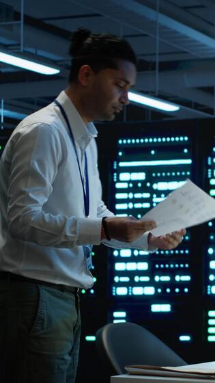 Vertical Admin in data center working with colleague to maintaining accurate documentation of equipment, generating reports. Server hub teamworking coworkers doing disaster recovery planning, camera A Pro Video