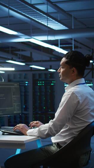 Vertical Developer and coworker overseeing data center, making improvements and updates to ensure system can handle networking tasks. Teamworking colleagues in server room tracking network traffic, camera B Pro Video