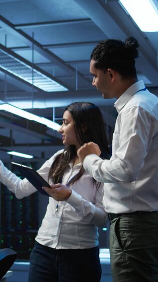 Vertical Team of technicians working on tablets in data center used for managing gear energy consumption. Teamworking colleagues using devices in workspace used for automation in server farm, camera B Pro Video