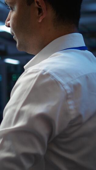 Vertical Computer scientist overseeing data center, making improvements and updates to ensure system can handle networking tasks. Close up of woman in server room tracking network traffic, camera B Pro Video