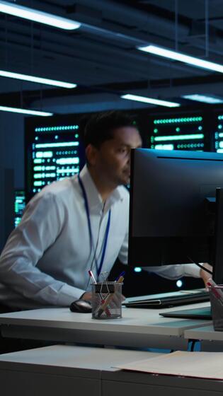 Vertical Management executive in data center ensuring system can handle networking tasks. Coworkers doing brainstorming in server room, tracking network traffic with PC, making improvements, camera B Pro Video