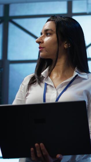 Vertical Admin in data center managing servers, operating systems and software programs. Tracking shot of woman in server hub ensuring networks are secure, up to date, and functioning properly, camera B Pro Video
