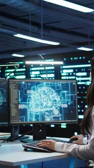 Vertical Technicians coworkers using AI tech on computer to do checkup in server room. Teamworking colleagues in data center using artificial intelligence technology to process datasets for training, camera B Pro Video