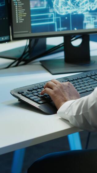 Vertical Computer scientist using AI tech on PC to do checkup in server room. IT staff member in data center using artificial intelligence technology to process datasets for training, camera A Pro Video
