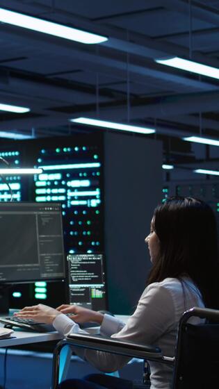 Vertical Person with paraplegia working in inclusive server hub workspace, typing on PC. Woman in wheelchair doing tasks in data center housing advanced data storage infrastructure, camera B Pro Video