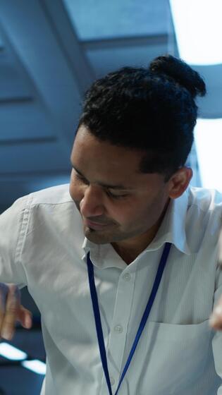 Vertical Teamworking colleagues in high tech data center managing and maintaining databases, ensuring data integrity, security and availability. Team of specialists updating server room systems, camera A Pro Video
