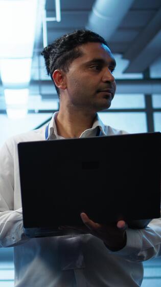Vertical System administrator in data center managing servers, operating systems and software applications. Expert in server hub ensuring networks are secure, up to date, and functioning properly, camera B Pro Video