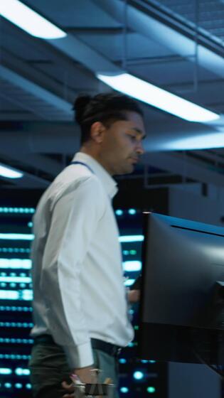 Vertical Team of programmers in high tech data center troubleshooting issues using tablet. Teamworking colleagues in server farm using device, establishing performance benchmarks, camera A Pro Video