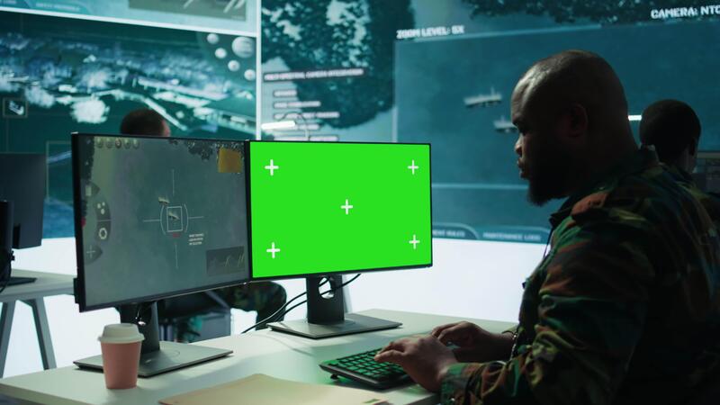 Army officer gathers intelligence from radar next to isolated copy space, working on satellite data monitoring from control room. Employs high tech gear and big screen in command post. Camera B. Pro Video