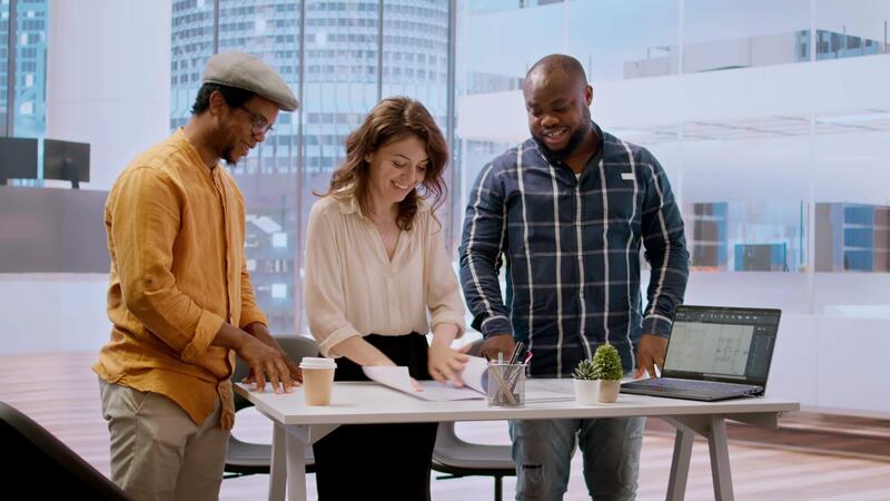 Professional clients and their real estate agent evaluating blueprints for the high class modern space, discussing leasing contract terms before signing. Startup business development. Camera A. Pro Video
