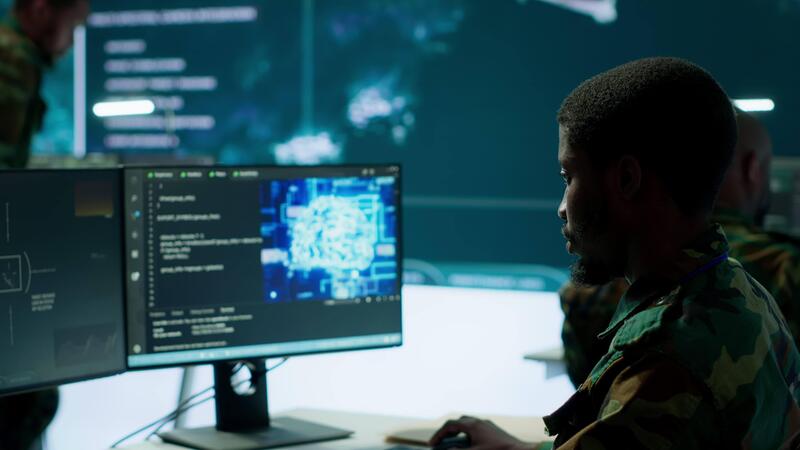 IT programming technician gathering information via neural network and artificial intelligence, employing programming language and new technology to help army operations. Deep learning. Camera A. Pro Video