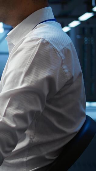 Vertical Admin in data center designing, implementing and managing gear to ensure optimal performance and reliability. Close up of expert typing on keyboard in server room, coding on computer, camera B Pro Video