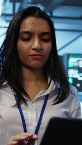 Vertical Engineer in high tech data center managing and maintaining databases, ensuring data integrity, security and availability. Indian woman updating server room supercomputers systems, camera B Pro Video