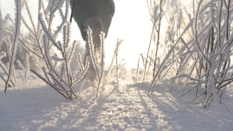 Winter white background. Creative . A view of small trees and twigs that stand in the inii and snow and a man on skis who is walking along the highway is visible from behind Pro Video