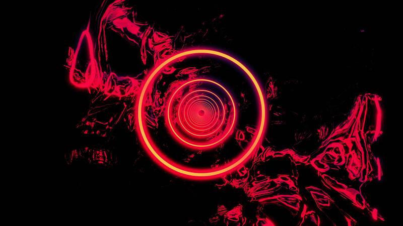 Black background. Design. Bright red circles in abstraction move forward next to the red paints and drawings around. Pro Video