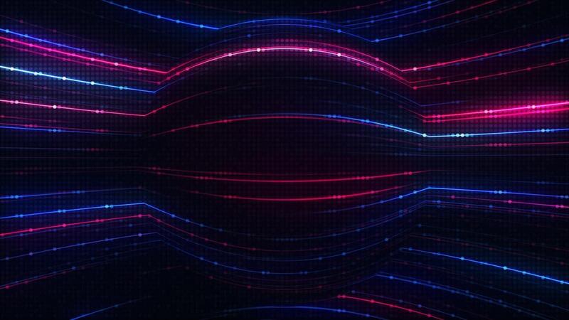 Technology background with glowing red and blue neon light beams and flashing digital data lights. Data visualization or network server concept. Sleek high-tech looping background. Free Video