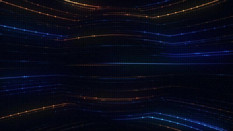 Technology background with glowing amber and blue neon light beams and flashing digital data lights. Data visualization or network server concept. Sleek high-tech looping background. Free Video