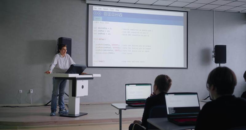 Programming And Coding Lesson In School For Gifted Children, Genius Boy Speaking In Front Classmates Pro Video