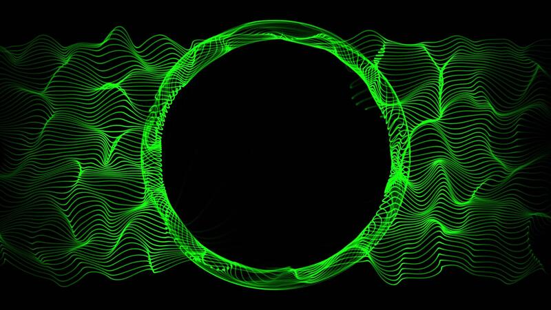 Abstract green ring made of floating strings with round empty space on a black background with bright glow effect. Elegant surreal animation with blank place for text or logo. Seamless loop , 4K 60fps Pro Video