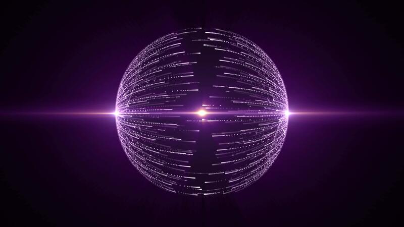 Looped background with transparent shiny sphere made of glow particle lines with orange and purple light. Dark abstract orb animation with bright atom or molecule structure. Seamless vj loop, 4K 60fps Pro Video