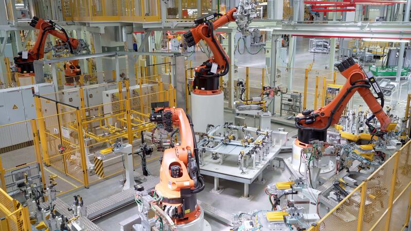 Russia, Moscow - May 7, 2022. Automated plant with robotics and workers. Scene. Lot of robotic machines create car parts in modern factory. Modern robotic equipment at factory with workers