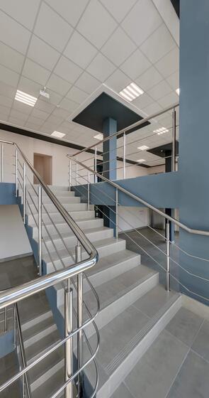 vertical loop rotation and panoramic view on emergency stairs in empty modern hall with columns, doors and panoramic windows overlooking the city. Free Video