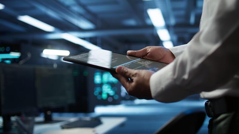 Data center admin responsible for installation of networking systems solving tasks in workspace. Close up of tablet used by IT worker doing maintenance on server farm gear, camera B Pro Video