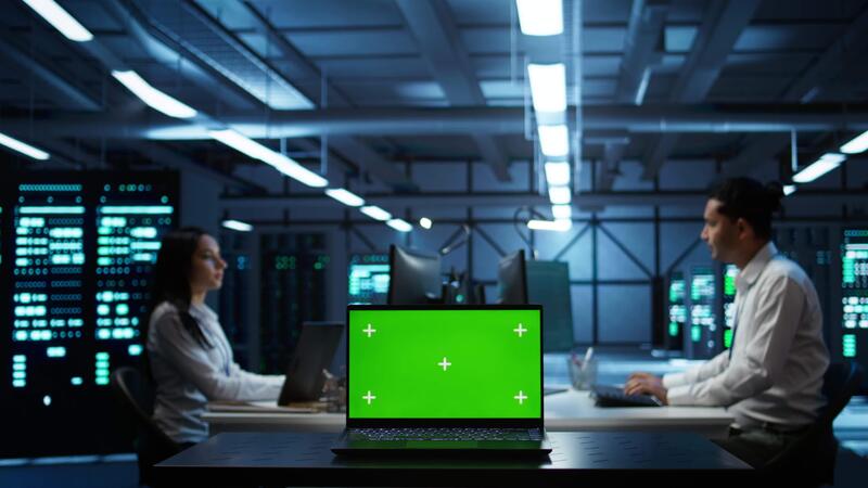 Focus on mockup laptop used by technician in data center in blurry background managing servers. Close up of chroma key notebook used by expert in server hub to ensure networks are secure, camera B Pro Video