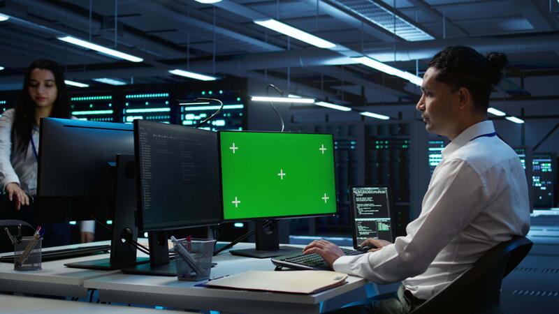 Engineer in data center monitoring security threats using mockup computer, implementing cybersecurity measures. Man using green screen PC, ensuring compliance with regulations, camera B Pro Video