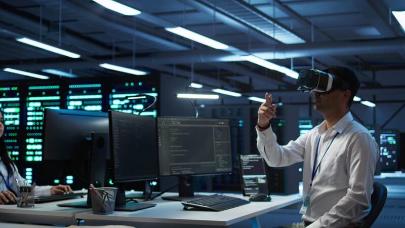 Engineer wearing VR headset in data center installing software on computer, troubleshooting issues. IT expert in server hub using virtual reality tech, establishing performance benchmarks, camera B Pro Video