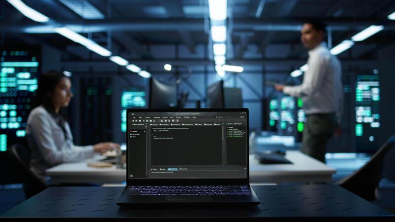 Close up of code running on laptop screen in data center used for managing gear energy consumption. Focus on notebook used by software developer in blurry background in server farm, camera B Pro Video