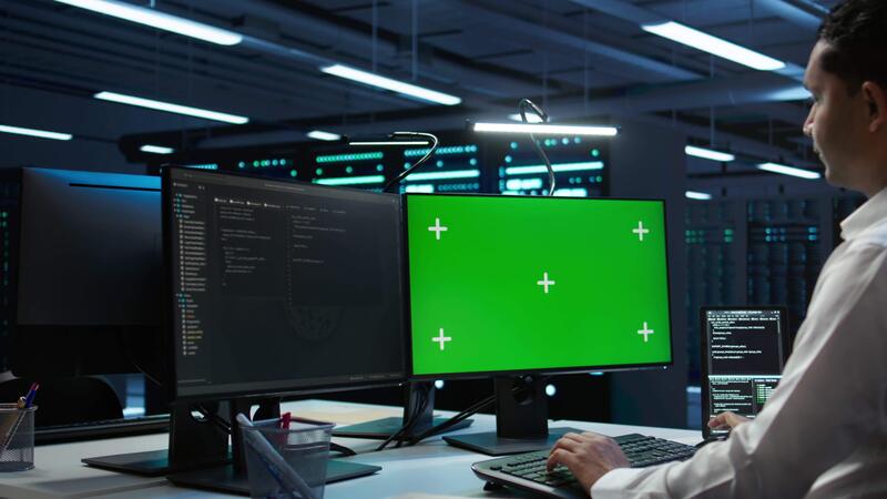 System administrator in data center installing software on isolated screen PC, troubleshooting issues. Admin uses mockup computer in server hub, establishing performance benchmarks, camera B Pro Video