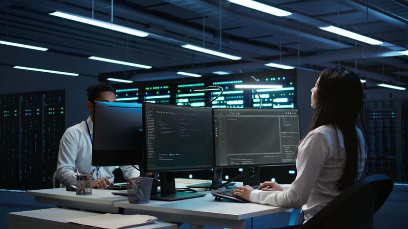Engineer using augmented reality tech in data center, installing software, troubleshooting issues. IT expert in server hub looks at AR hologram, establishing performance benchmarks, camera B Pro Video