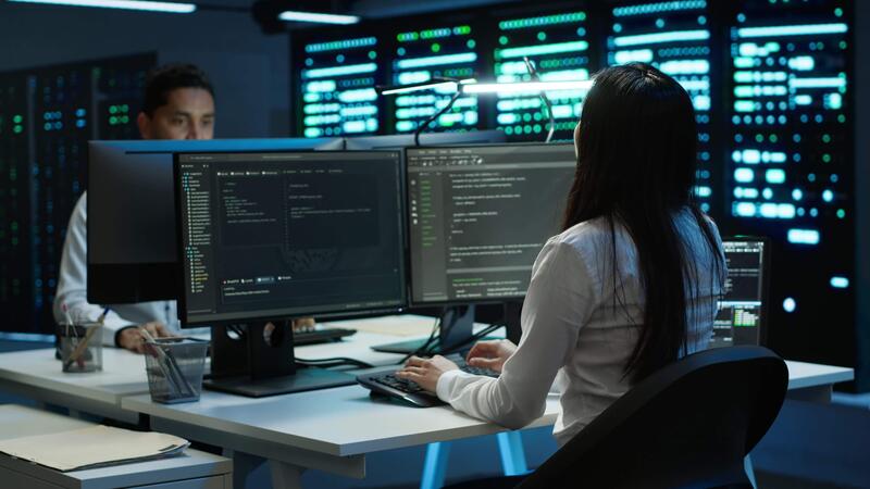 Engineer using augmented reality tech in data center, installing software, troubleshooting issues. IT expert in server hub looks at AR hologram, establishing performance benchmarks, camera A Pro Video